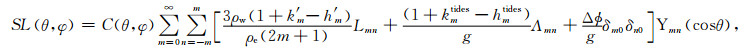 这里Me是地球整体质量,Pm是m阶勒让德函数,h'm,k'm为m阶负荷勒夫数,分别表征固体地球垂向位移和地球形变(质量重新分布)导致的附加位影响.整体负荷L按空间分为陆地I(θ,φ)和海洋SL(θ,φ)变化,即