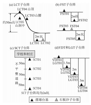 2 对比观测台站在山西省临汾市五个具有典型地质条件和环境噪声的地点,分别进行了不同台基条件和环境噪声的对比观测实验,建立了5个子台阵共22个流动地震对比观测实验台站,台站的分布如图 1b.表 1给出了各子台阵的地质条件、噪声水平及实验目的.图 2是各子台阵中台站分布示意图.图 3a是本实验中采用的摆墩台基安装方式,图 3b是沙子台基安装方式.所有台站采用统一的架设方案,图 3c是流动观测台站的外观,简洁、美观,并且基本能满足流动地震观测的需要.