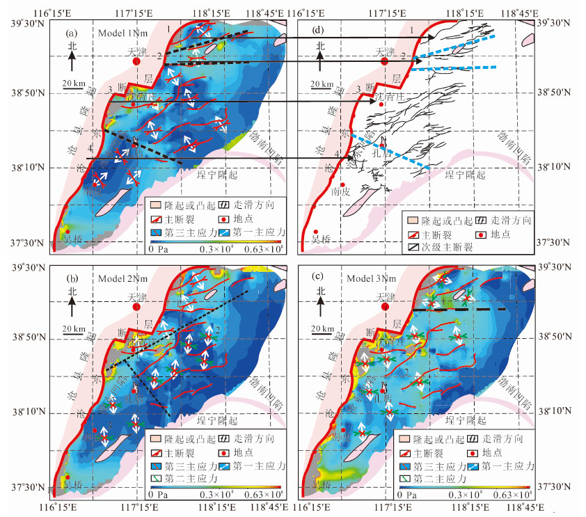 当黄骅坳陷受到北西向拉张作用时(图 7c),应力强度分布特征与第一主应力分布特征相一致,说明区内断层的形成主要受拉张作用的影响.而根据主应力方向,以海河-新港断层为界可将坳陷划分为南北两个部分.北部第一主应力方向为NWW向、第二主应力方向为NEE向、第三主应力方向为垂直向下,由此能够形成NEE向正断层,这与区域断层走向存在差异.南部第一主应力方向为NNW向、第二主应力方向为NEE向、第三主应力方向垂直向下,由此能够形成NEE向正断层,这同样与区域断层走向存在差异.