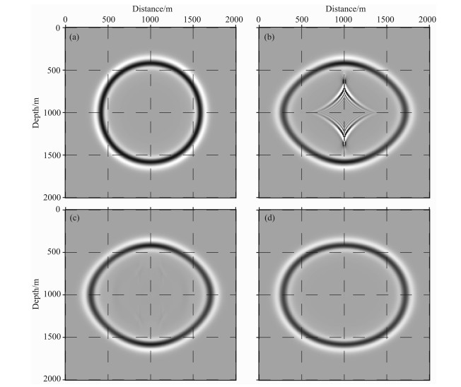 本节中, 我们计算了一个理论背景均匀模型的地震响应.该模型的网格点为201×201, 空间采样间隔为10m×10m.震源函数为Ricker子波, 主频为20Hz, 时间采样间隔为1ms, 震源位于模型中央(1000m, 1000m).图 2给出了不同情况下0.25s的波场快照.图 2a为声波波动方程(即各向异性参数ε=0且δ=0)计算的波场快照, 图 2(b-d)为VTI介质声波波动方程计算得到的波场快照, 对应的各向异性参数(ε, δ)分别为(0.25, 0), (0.25, 0)和(0.25, 0.25).图 2b和图 2c采用了相同的各向异性参数, 但图 2b未做震源校正而产生了剪切波的数值噪声, 图 2c做了震源校正(即在震源附近通过光滑平均, 令ε=δ)而避免了数值噪声.尽管图 2c在震源附近对各向异性参数做了近似, 但并未改变或很小的改变准P的相位.图 2d中, 由于各向异性参数相等而未出现剪切波的数值噪声.需要注意的是, 图 2采用了相同的增益, 而各向异性声波方程计算得到的波场快照的振幅明显不同于各向同性声波方程计算的波场快照的振幅.