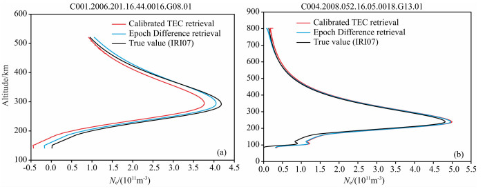 3 基于模拟数据掩星反演及误差分析掩星模拟研究是基于COSMIC掩星事件的空间信息, COSMIC实测TEC值被国际参考电离层2007 (International Reference Ionosphere 2007, IRI2007)模式TEC值取代, 详细请参见文献[14].按上述两种反演方法, 利用模拟值进行反演计算, 算例结果如图 2所示.图 2a是LEO轨道高度为500km的模拟掩星数据反演结果, 图 2b是800km高度的模拟掩星数据的反演结果.由图 2可知, 对于较低LEO轨道(约500km)的模拟反演计算, 改正TEC反演与真值(IRI07模式值)存在一定差异, 而历元间差分反演与真值较为接近; 而对于较高LEO轨道(约800km)的模拟反演, 历元差分和基于改正TEC反演结果基本一致, 与真值吻合.