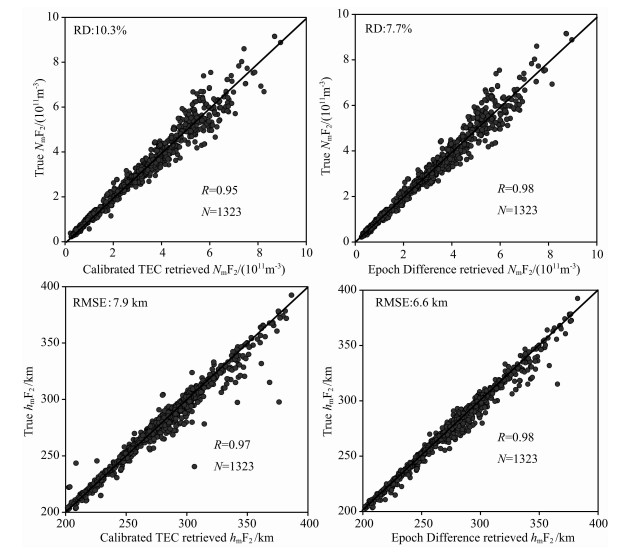 4 结论本文首先介绍源于COSMIC的改正TEC反演方法, 为提高反演精度, 提出了一种新的方法-历元差分的电离层反演方法, 并基于模拟掩星反演结果详细讨论了两种方法的反演误差, 最后得到结论:历元差分反演精度较改正TEC反演精度均有所提高; 不管是哪种方法, 高轨(约800km)反演结果优于低轨(约500km); 随着剖面高度的降低, 反演精度随之下降; 上述两种反演误差主要集中在8至16时(当地时), 主要分布在磁纬-30°~30°之间.在磁赤道, NmF2被高估, 在磁赤道两侧的低纬地区, NmF2被低估.而hmF2则与NmF2相反, 在磁赤道, hmF2被低估, 在磁赤道两侧, hmF2被高估.