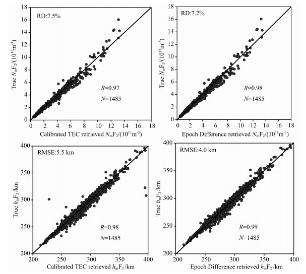图 4 改正TEC与历元差分反演的NmF2和hmF2与真值的相关系数示意图 LEO轨道高度约为800km,N和R分别为匹配数据和相关系数. Fig. 4 Correlations between NmF2 and hmF2 retrieved from Calibrated TEC and Epoch Difference inversion techniques and those derived from IRI07 The orbit altitudes are about 800km, the number of data points N and the correlation coefficient R are also shown. |