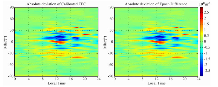 图 5 改正TEC与历元差分反演的NmF2与真值的绝对偏差时空示意图 Fig. 5 Geomagnetic latitude and local time variations of absolute deviation betweentheNmF2 retrieved from Calibrated TEC and Epoch Difference inversion techniques and the truevalue |