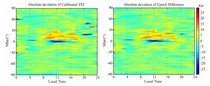 图 6 改正TEC与历元差分反演的hmF2与真值的绝对偏差时空示意图 Fig. 6 Geomagnetic latitude and local time variations of absolute deviation between the hmF2 retrieved from Calibrated TEC and Epoch Difference inversion techniques and the true value |
