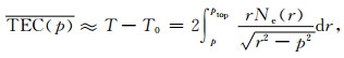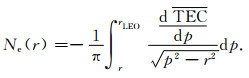 式(2)中, T0表示LEO轨道以上的电离层TEC, 在LEO与GPS弧段近似同一面的条件下, 可通过非掩星侧数据获得[13].p为掩星切点到地心的距离, 称为碰撞高度.ptop ≡rLEO, rLEO为LEO轨道半径.式(2)通过Abel变换可得[10]: