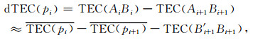 令dTEC为相邻两历元TEC之差, 即dTEC (pi)=TEC (AiCi)-TEC (Ai+1Ci+1).对于采样率为1Hz的LEO掩星观测数据而言, TEC (BiCi)与TEC (Bi+1Ci+1)几乎相等(当LEO较低时, 由于LEO高度附近的电子密度较大, 该近似的误差会增大).因此,