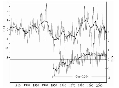 图 1 标准化的逐季PDO指数(上部)以及IHO指数(下部),其中细实线为原始指数,粗实线为5年滑动平均处理后的相应指数 Fig. 1 Standardized seasonal PDO index (upper panel) and IHO index (bottom panel). The thick lines denote 5-year running means. The simultaneous correlation coefficient between two indices is 0.364 (above significance level of 0.01 by 1000 Monte Carlo simulations) |