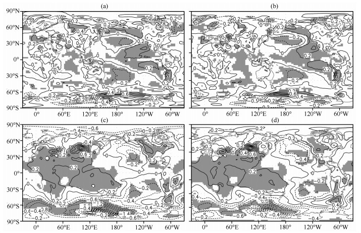 图 3 地表温度异常与地表气压异常分别对标准化Pdec和Idec的回归系数.其中,(a,b)分别对应地表气温对Pdec和Idec的回归,(c,d)分别对应地表气压对Pdec和Idec的回归.单位:(a,b)℃;(c,d) hPa.阴影区表示数值通过了0.05信度的蒙特卡洛(MonteCarlo)随机检验 Fig. 3 The regression of (a, b) surface air temperature anomalies and (c, d) surface pressure anomalies onto Pdec and Idec. Left panels are for Pdec, and the right ones for Idec. The units are in ℃ in the upper panel and in hPa in the bottom panel. Shaded denote values exceeding the 0.05 significance level in 1000 times of Monte Carlo simulations |