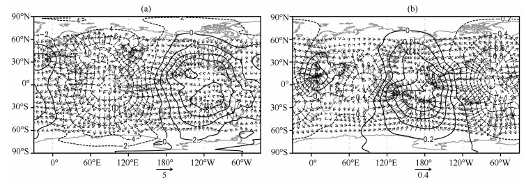 图 4 整层积分(a)和200hPa (b)的异常速度势及对应矢量风对Pdec的回归系数.单位:(a)108kg·s-1(等值线),102kg·m-1·s-1(矢量);(b)106m2·s-1(等值线),m·s-1(矢量) Fig. 4 Regressions of (a) velocity potential anomalies (vertically integrated) and (b) those at 200 hPa onto Pdec. Superimposed vectors are for their correspondingly regressed winds. Units are in 108kg·s-1 (contour) and in 102 kg·m-1·s-1 (vector) in (a), and in 106m2·s-1(contour) and in m·s-1 (vector) in (b) |