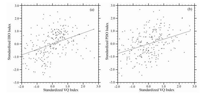 图 5 逐季标准化IHO指数(a)及PDO指数(b)与标准化向北输送越赤道质量流指数(VQ)的散点关系图.直线为各散点之间的线性拟合.其中VQ指数与IHO指数和PDO指数的线性相关系数分别为0.427和0.374,均通过了0.01信度的蒙特卡洛(Monte Carlo)随机显著性检验 Fig. 5 Scatter plot of (a) standardized IHO with standardized cross-equator air mass flux (VQ), and (b) standardized PDO with VQ. Solid line represents the linear-fitting of IHO with VQ in (a), and PDO with VQ in (b). The correlation coefficients of IHO and PDO respectively with VQ are 0.427 and 0.374, which are significant above 0.01 level of significance in 1000 times of Monte Carlo simulations |