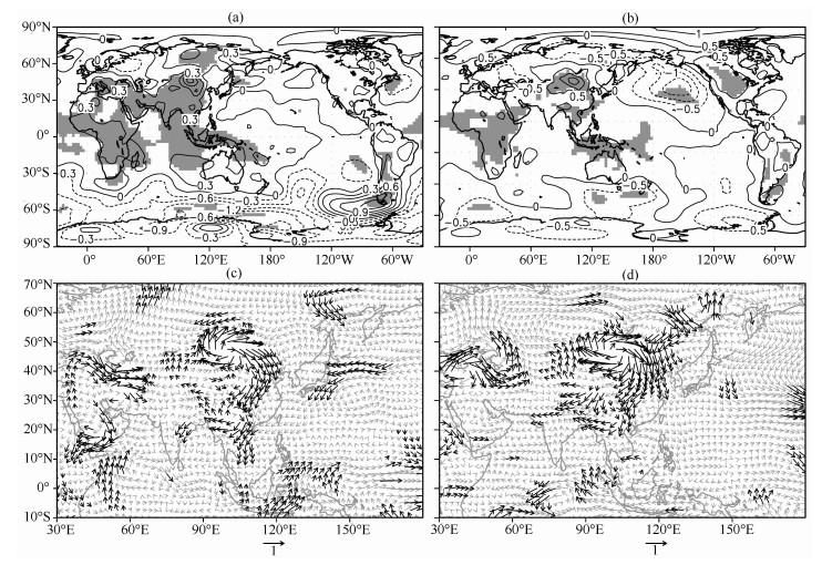 图 6 冬(a,c)、夏(b,d)季地表气压与850hPa风场异常对同期Pdec的回归系数.其中,(a,b)对应地表气压,(c,d)对应850hPa风场.单位:(a,b) hPa;(c,d) m·s-1.阴影和粗矢量均表示通过0.05信度的蒙特卡洛(Monte Carlo)随机检验 Fig. 6 Regression of anomalies of surface pressure (a, b) and 850 hPa horizontal winds (c, d) in boreal summer and winter onto simultaneous Pdec. Left panels are for summer, and right panels for winter. The units are in hPa in upper panels and in m·s-1 in bottom panels. Shaded in upper panels and bold vectors in bottom panels denote values exceeding the 0.05 significance level in 1000 Monte Carlo simulations |