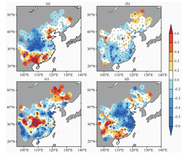 图 7 冬夏季我国东部站点气温(上)、降水(下)与同期Pdec指数的相关系数.其中(a、c)为夏季同期相关,(b、d)为冬季同期相关.站点要素已做5年滑动平均处理.空心圈表示通过信度为0.05的蒙特卡洛(MonteCarlo)随机检验,实心点为未通过检验的站点 Fig. 7 Simultaneous correlations of station temperature (a, b) and precipitation (c, d) in boreal summer and winter with Pdec. Left panels are for summer, and right panels for winter. Circles denote values exceeding the 0.05 significance level in 1000 Monte Carlo simulations |