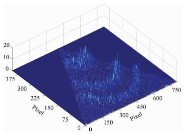 3.1 数据预处理由于气辉的辐射强度一般较弱,实际测量的FPI干涉图像对比度较低,极易受到噪声的影响和干扰,表现为局部光强发生突变或者出现奇异值.这些噪声除来自宇宙射线的干扰外,还来自杂散光的影响,包括仪器本身和周围环境的扰动,它们会直接影响圆心和条纹峰值位置的确定.因此,进行风速反演前,首先需要对FPI干涉图进行噪声去除预处理:包括均值滤波[26]和自适应滤波[27].图 3为Zemax软件模拟仿真FPI系统得到的处理前干涉光强分布图(三维),图中干涉光强分布参差不齐,噪声明显;经过噪声处理后,干涉光强分布如图 4所示,图中光强分布相对比较平滑,干涉环状分布明显,噪声得到抑制.