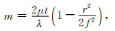 式(2)中,t为FPI标准板间距,μ为板间介质的折射率,λ为入射光波长,θ为FPI标准具腔内反射角.当θ非常接近于零时,则θ≈tanθ=r/f,将式(2)进行泰勒级数展开得: