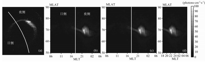 图 1 UVI图像与MLT-MLAT网格图像转换示例(1996年12月18日05:36:08) (a)为原始UVI图像;(b)为UVI图像对应的MLT-MLAT网格图像;(c)为(b)平滑处理之后的结果;(d)为(c)的夜侧图像. Fig. 1 An example of transforming UVI images into MLT-MLAT grid images. The image occurred at 05:36:08 of December 18, 1996 (a) The original UVI image; (b) The MLT-MLAT grid image with the x axis being mlt and y axis being mlat; (c) The smooth processing result of (b); and (d) only gives the nightside image. |