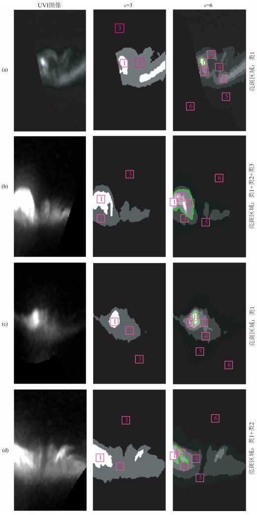 图 2 SFCM聚类确定亮斑区域第一列给出的是UVI图像.第二列给出的是SFCM聚成三类的结果,白色、灰色、黑色区域分别表示亮斑区、极光卵区和背景区.第三列给出的是SFCM聚成6类的结果,强度由强至弱分别对应类1(白色区域)到类6(黑色区域).绿色曲线包围的区域就是本文算法确定的亮斑区域. (a)1997-01-28-12:03:13;(b)1996-12-04-00:02:49;(c)1997-01-04-05:29:58;(d)1997-01-26-22:39:39. Fig. 2 Determining bright bulge areas with SFCM clustering algorithm The left column illustrates the UVI images.The middle column is the clustering results with cluster number c=3, where the white areas, gray areas and black areas represent the bright bulge, polar oval and background respectively.The right column gives the clustering results with cluster number c=6, where the clusters from 1 to 6 are mapped to the clusters with the luminosity from strong to weak and the identified bright bulge areas are labeled with green line. |