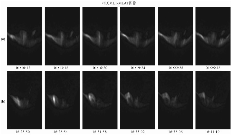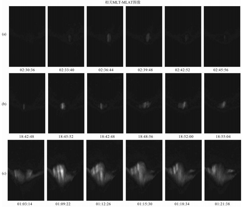 (4)亮斑消失:亚暴结束后,之前出现亮斑的区域的极光强度恢复到亚暴之前的强度水平.以上四种形态变化中,亮斑突现与增强膨胀两过程对应亚暴的膨胀相,膨胀消退与亮斑消失两过程对应亚暴的恢复相.