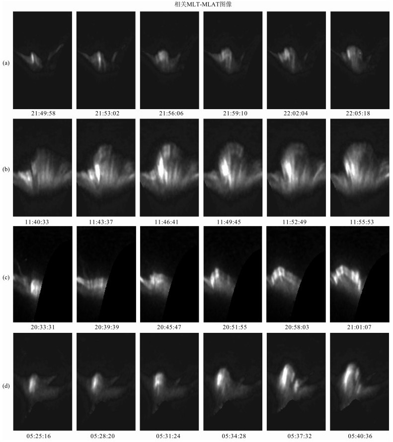 (1)是亚暴事件而Liou漏标了. 图 4给出了发生在1997年1月的四个例子.从图 4给出的UVI图像序列,我们很容易看出这些事件均满足亚暴定义中对亮斑变化的那些要求;此外,我们还发现这四个事件也被包含在从SuperMAG求得SME指数确定的亚暴事件列表中[27-28].