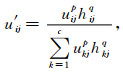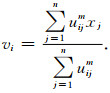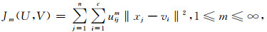 式中,n为样本点数,c为聚类数,uij为第j个样本xj相对于第i个聚类中心vi的隶属度,m是控制模糊度的模糊权重,‖*‖是欧式距离表相似度,为了方便下面我们将‖xj-vi‖2简记为di j.对所有输入参量求导,使式(1)达到最小的必要条件为: