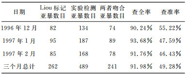 从表 1可以看出,这三个月中亚暴查全率均高于90%,也就是说Liou标记的亚暴事件中绝大多数都被检测出来了;可与查全率相对应的查准率只有50%左右,也就是说,我们检测的事件中有差不多一半Liou没有标记.深入分析Liou的标记和本文实验结果,我们发现Liou的标记很不全,而且还受人为偏差的影响.更详细的结果分析见4.2节.