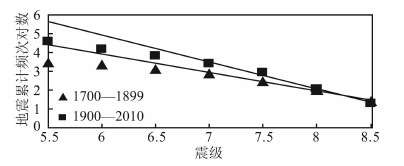 为了能更清楚地了解资料的完备程度,图 1对有仪器记录以来的地震(1900-2010年)和历史地震(1700-1899年)分别进行统计,从图中可以看出,两个时间段中全球地震目录资料最小完备震级都为7级,且1900-2010年时间段中的地震目录相对较为完善.因此,选取全球M≥7级地震目录作为本文的研究资料.