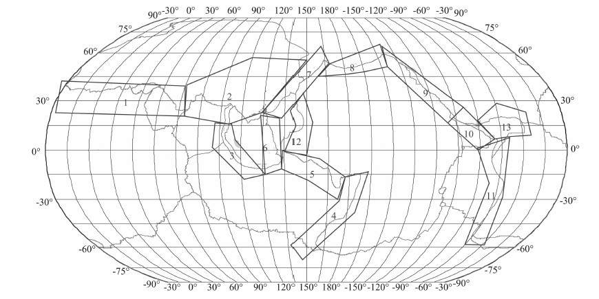 图 2 全球各地震区(带)研究区域划分示意图 1西欧亚带;2中国大陆及邻区;3印尼带;4库克群岛-巴勒尼群岛带;5新几内亚-洛德豪岛带;6菲律宾-努沙登加拉群岛带;7千岛群岛-台湾岛带;8阿留申群岛带;9阿拉斯加湾-瓜达卢佩岛带;10墨西哥-科科岛带;11科隆群岛-火地岛带;12菲律宾板块东边界带;13开曼群岛-委内瑞拉带. Fig. 2 A schematic showing the globe divided into various seismic zones A schematic showing the globe divided into various seismic zones 1 West Eurasian zone; 2 Mainland China and its vicinity; 3 Indonesia; 4 Cook Islands-Balleny Isands; 5 New Guinea-Lord Howe Island; 6 Philippines-Nusa Tenggara; 7 Kuril Islands-Taiwan Island; 8 Aleutian Islands; 9 Alaska-Guadalupe; 10 Mexico-Coco Islands; 11 Colon-fuego; 12 East boundary of Philippine plate; 13 Cayman Islands-Venezuela Islands. |