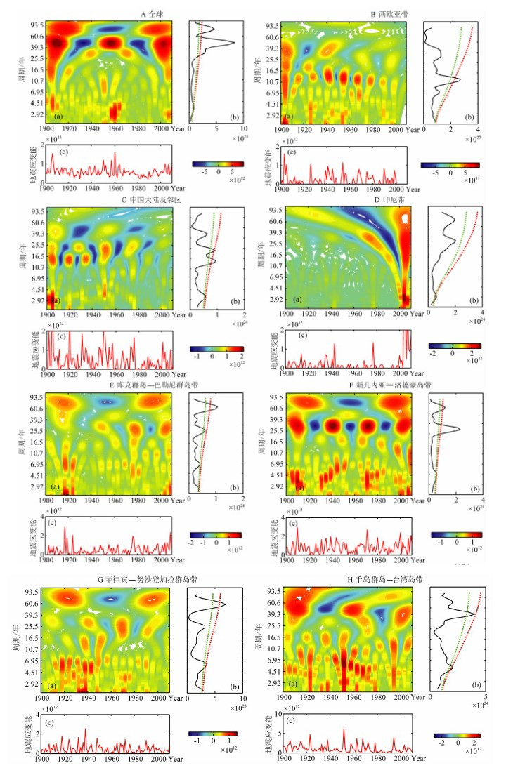 5 结论与讨论本文利用Morlet小波变换方法和上述研究方案,分析全球和各地震区带的活动周期谱特征,并给出周期谱的显著性检验,得到以下结论: