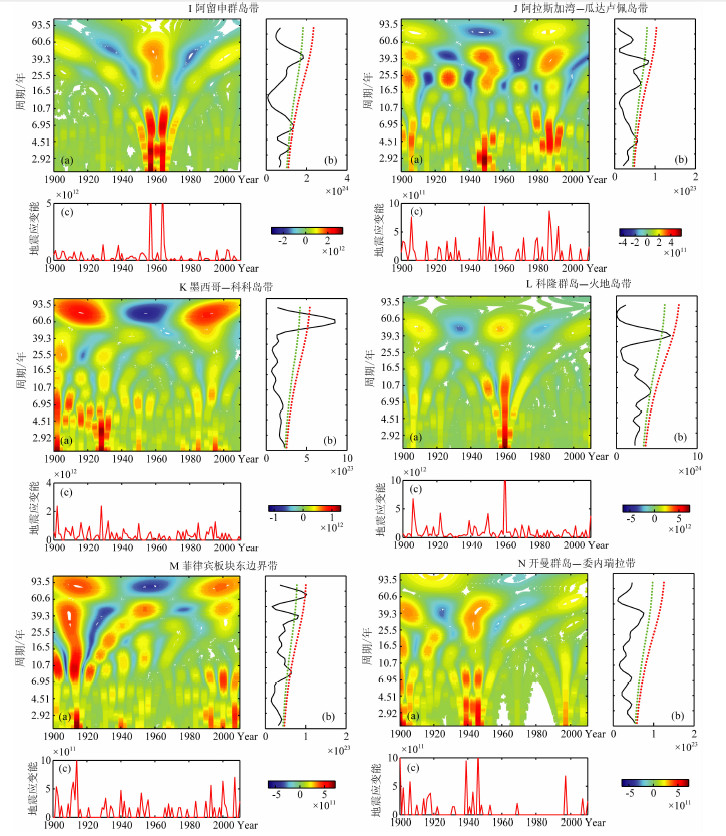 图 4 1900-2010年全球及各地震区带地震活动应变能Morlet小波变换(二) Fig. 4 Morlet wavelet transformation for the strain energies associated with earthquakes occurred globally and in various seismic zones during 1900-2010 (Part2) |