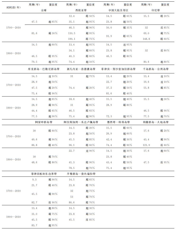 (1)1700-2010年所得结果和1900-2010年所得结果相比,周期具体数值略有差异,有些周期缺失,但总体来说,主要周期成分基本一致,表明本文所用的地震目录资料和所得结果是可靠的.