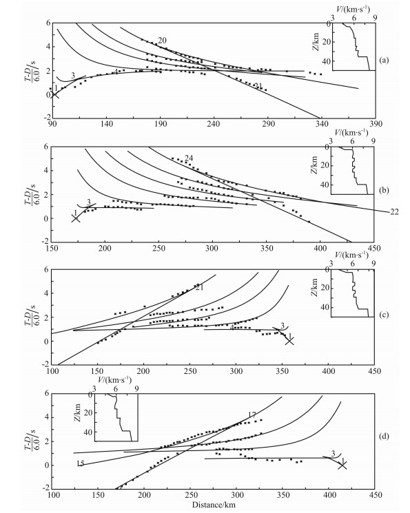 在四个剖面上(图 3),Pg和Pm波震相清楚,可直接辨认,其中Pg为初至波,Pm为来自Moho面的能量很强的反射波.除此之外,还有四组来自壳内的反射波P1、P2、P3、P4,其能量虽较弱,但仍可辨认.另外,作为上地幔顶部的折射波Pn,在各炮记录震中距150km以外可识别.