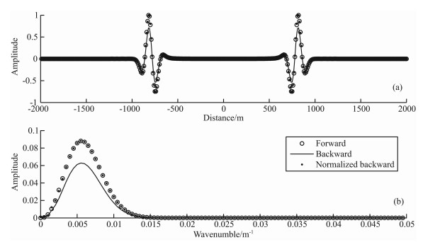 图 1 正传波形与记录单层边界逆传波形的对比 (a)正传至0.5s波形和回传至0.5s波形比较.圆圈表示正传波形,线条表示逆传波形,圆点表示同正传波形做归一化后的逆传波形;(b)正传至0.5s波形和回传至0.5s波形的频谱比较.圆圈表示正传波形频谱,线条表示逆传波形频谱,圆点表示同正传波形做归一化后的逆传波形频谱. Fig. 1 The contrast of waveform between forward and backward propagation by recording one layer of boundary (a) The contrast of waveform between forward and backward propagation at the same time (0.5s).The circle indicates forward propagated waveform, the line indicates backward propagated waveform and the spot indicates normalized backward propagated waveform with forward propagated waveform; (b) The contrast of waveform spectrum between forwardand backward propagation at the same time (0.5s).The circle indicates forward propagated waveform spectrum, the line indicates backward propagated waveform spectrum and the spot indicates normalized backward propagated waveform with forward propagated waveform spectrum. |