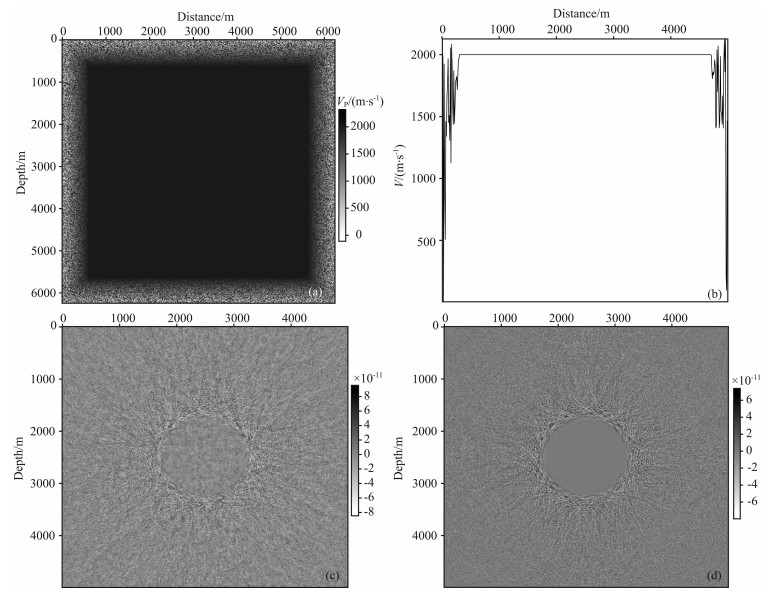 图 2 随机边界速度模型和正传逆传误差 (a)生成的随机边界速度模型,背景速度为2000m/s;(b)随机边界速度模型的横向剖面;(c)使用随机边界正传波场和逆传波场在0.5s的误差;(d)利用记录n/2+1层边界正传波场和逆传波场在0.5s的误差. Fig. 2 The random velocity boundary model and the error of waveform between forward and backward propagation at the same time (a) The random velocity boundary model with background as 2000m/s; (b) One section of the random velocity boundary; (c) The error of wavefield between forward and backward propagation with random boundary at 0.5s;(d) The error of wavefield between forward and backward propagation with absorbing boundary by recording n/2+1 layers of boundary at 0.5s |