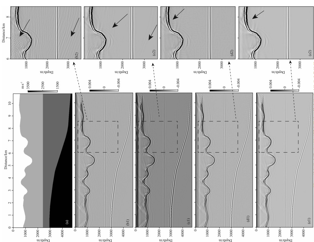 如图 3b1和图 3b2中箭头所示,当四周均为随机边界时,上边界的随机速度介质同人工震源距离太近,导致漫反射带来的反射假象严重影响成像质量.当上表面采用自由反射边界,其余采用随机边界时,成像如图 3c1所示,不需要额外存储波场信息,计算时也不需要额外计算上边界内区域的波场传播,内存最少,计算效率最高,但会形成一些自由表面反射假象,在图 3c2中箭头所示位置较为明显.当上表面采用吸收边界其余三边界采用随机边界时,需要记录每时刻波场上边界信息,成像结果如图 3d1所示,其细节图 3d2同图 3c2相比,没有自由表面产生的边界反射假象.如图 3e1所示,四边界均采用吸收边界,记录波场边界逆传时载入的成像结果是最好的.图 3e2的成像效果比图 3d2更加清晰干净,如图中箭头所示,说明随机边界带来的漫反射影响不能通过叠加得到完全的抵消;总体能量相比图 图 3d1和图 3c1弱,这也证明了记录一层边界会带来一定的能量损失,但不会影响成像质量.当模拟资料采用带有多次波的记录时,不管逆时偏移正传逆传过程中上表面采用何种边界时,成像均会产生多次波假象[25],但若上表面采用自由反射边界,会比采用吸收边界多出一部分上表面反射假象,成像效果也是采用吸收边界时更好.