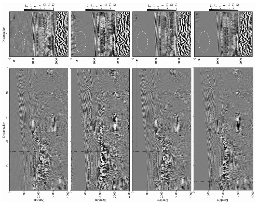 图 4 某海域实际资料运用不同边界处理策略的逆时偏移成像结果 (a1)四周为随机边界逆时偏移成像结果;(b1)上表面为自由反射边界,其余为随机边界逆时偏移成像结果;(c1)上表面为吸收边界,其余为随机边界逆时偏移成像结果;(d1)四周为吸收边界逆时偏移成像结果;(a2),(b2),(c2),(d2)分别为(a1),(b1),(c1),(d1)方框位置放大细节. Fig. 4 RTM images of a field data by different boundary treatments (a1) The RTM image by setting random boundary for all boundaries; (b1) The RTM image by setting free boundary for surface and others random boundary; (c1) The RTM image by setting absorbing boundary for surface and others random boundary; (d1) The RTM image by setting absorbing boundary for all boundaries; (a2), (b2), (c2), (d2) are the details for (a1), (b1), (c1), (d1) respectively. |