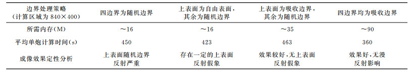 表 2 崎岖海底模型运用不同边界处理策略所需内存,时间对比和成像效果定性分析 Table 2 The contrast of memory and costing time for rugged water-bottom model by different boundary treatment and qualitative analysis of imaging results |