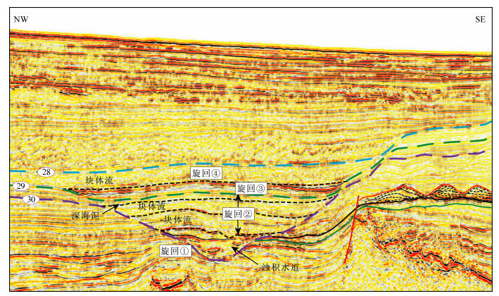 图 2 典型中央峡谷浊积水道解释剖面 Fig. 2 Typical turbidite channel reservoir seismic interpretation profile in the center canyon |