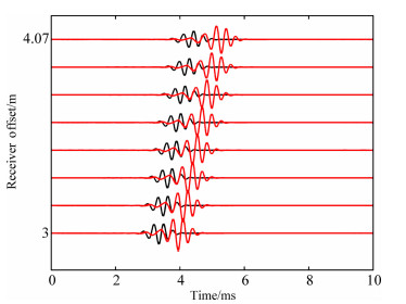 图 2 偶极子全波列波形图,模型1(黑色)和模型2(红色) Fig. 2 Dipole waveforms of model one (black) and model two (red) |