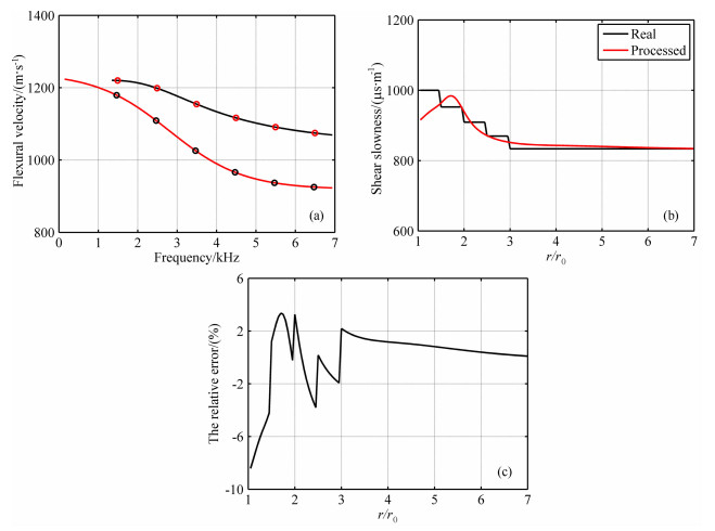 图 4b中红色曲线为反演计算得到的地层横波慢度的径向分布,黑色阶梯状曲线为地层横波慢度真实的径向分布.反演结果相对误差的径向分布见图 4c,从图中可以看到反演结果相对误差基本控制在10%以内,并且离井壁越近,误差相对越大.