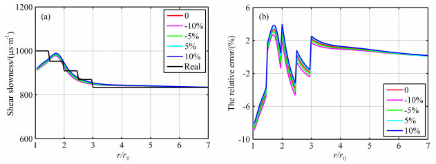 其次研究了井外地层纵波慢度sp分别存在-10%、-5%、5%和10%的误差时对反演结果的影响.反演的与实际的地层横波慢度的径向分布见图 6a,反演结果的相对误差的径向分布见图 6b.我们注意到,sp存在误差与sp无误差的反演结果也保持了很好的一致性,这也是计算时假设地层纵波慢度为一固定值的原因.