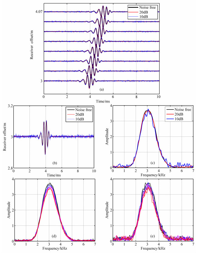 图 7显示了分别添加了一次SNR=20dB和SNR=10dB的高斯白噪声后的波形曲线和频谱曲线.图 7a中黑色、红色和蓝色曲线分别表示:无噪声时、存在SNR=20dB和SNR=10dB的噪声时的偶极全波列波形;图 7b的曲线为相应的第一道波形,图 7c为相应的第一道波形的频谱(图中标示了噪声的大小),图 7d为SNR=20dB时八道波列的频谱,图 7e为SNR=10dB时八道波列的频谱.从图 7a和7b看到噪声对波形的影响似乎不太明显,但是从图 7c-7e看到,噪声的存在使得低频和高频处频谱相关性较差,进而导致提取的弯曲波在这些频段范围内出现异常点,这也是对提取的弯曲波进行拟合的主要原因.