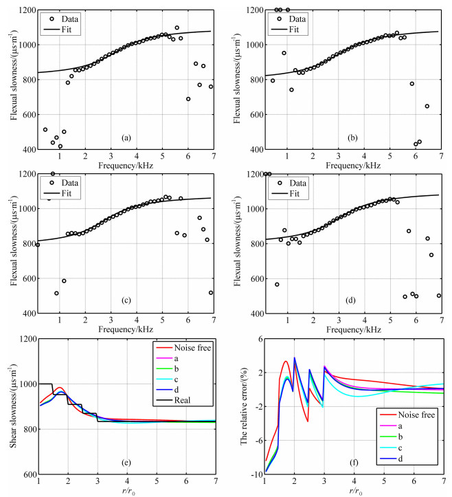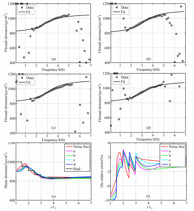 图 9 (a-d)SNR=10dB时提取(圈状)和拟合(线状)的弯曲波频散;(e)反演的与实际的地层横波慢度的径向分布;(f)反演的与实际的地层横波慢度之间相对误差的径向分布 Fig. 9 (a-d) Extractive (circle) and fitted (line) flexural dispersion curves when SNR=20 dB; (e) Inverted and actual radial profiles of shear wave slowness; (f) Radial profile of relative error between inverted and actual shear wave slowness |