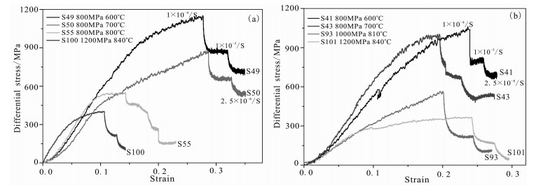 实验围压800~1200 MPa,温度为600~840 ℃,应变速率1×10-4s-1,1×10-5s-1和2.5×10-6s-1.