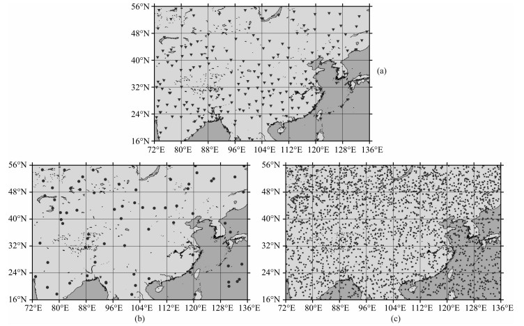 图 1 中国区域无线电探空站和掩星事件分布图 (a)中倒三角形表示探空站,(b)、(c)中小圆点分别表示COSMIC掩星任务2008年1月2日、2008年1月份的掩星事件. Fig. 1 The locations of radiosonde stations (the inverted triangles in (a)) and radio occultation observations on Jan2, 2008(the solid circles in (b)) and in Jan 2008(the solid circles in (c)) over China |