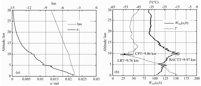 参数a的选取与廓线高度区间有关.当给定某个a值后,Wlnα(a,b)将随着高度b而变化.当Wlnα(a,b)取极大值时,对应的高度b=bp即为对流层顶高度.
