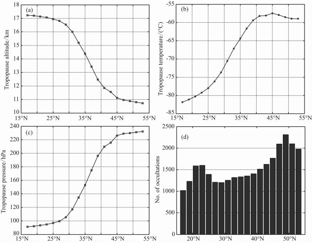 图 3 2008年中国区域对流层顶高度(a)、温度(b)、气压(c)和掩星事件数量(d)随纬度的变化 Fig. 3 The variation of tropopause height (a), temperature (b), pressure (c) and number of occultations (d) with latitude over China in 2008 |