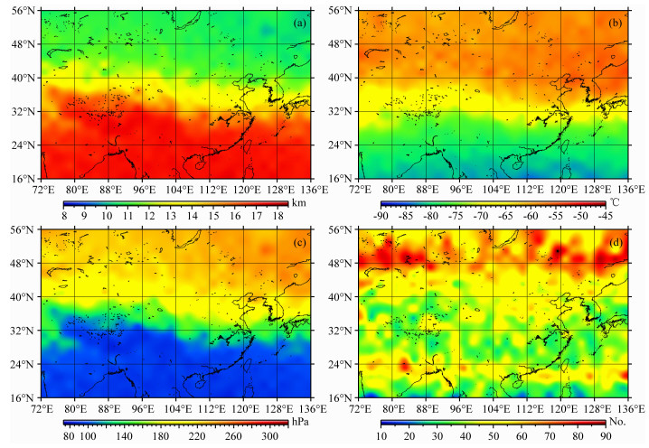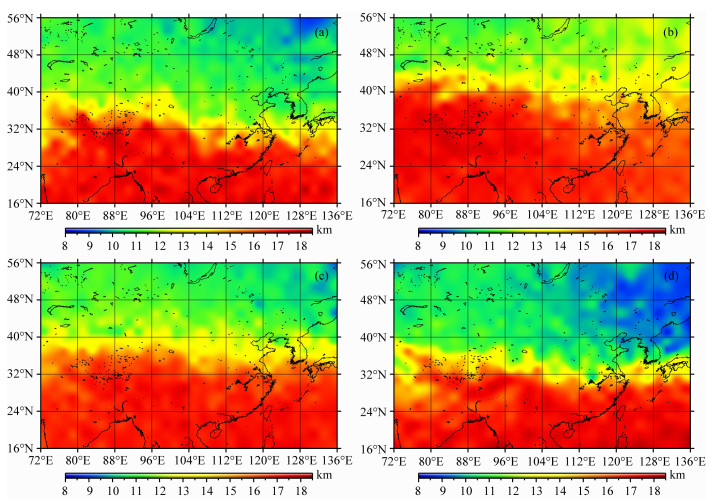 图 5 2008年春(a)、夏(b)、秋(c)、冬(d)四个季节中国区域对流层顶高度的分布 Fig. 5 The tropopause height in spring (a), summer (b), autumn (c) and winter (d) over China in 2008 |