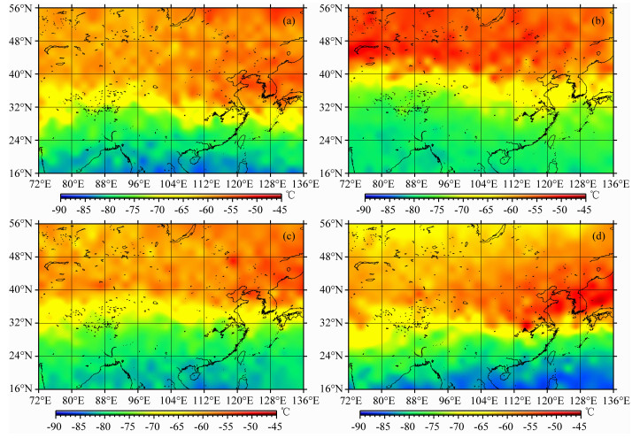 图 6 2008年春(a)、夏(b)、秋(c)、冬(d)四个季节中国区域对流层顶温度的分布 Fig. 6 The tropopause temperature in spring (a), summer (b), autumn (c), and winter (d) over China in 2008 |