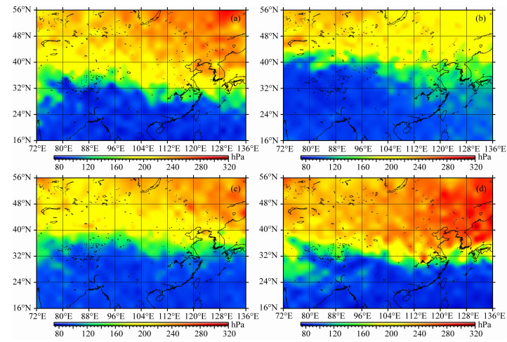 图 7 2008年春(a)、夏(b)、秋(c)、冬(d)四个季节中国区域对流层顶气压的分布 Fig. 7 The tropopause pressure in spring (a), summer (b), autumn (c), and winter (d) over China in 2008 |