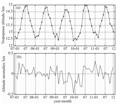 图 8 2007年1月至2011年12月中国区域对流层顶高度月平均变化 (a)表示对流层顶高度的月平均变化,(b)表示去除季节性变化的对流层顶高度月平均距平变化. Fig. 8 The tropopause height monthly means (a) and its de-seasonal monthly anomalies (b) during the period between Jan 2007 and Dec 2011 over China |